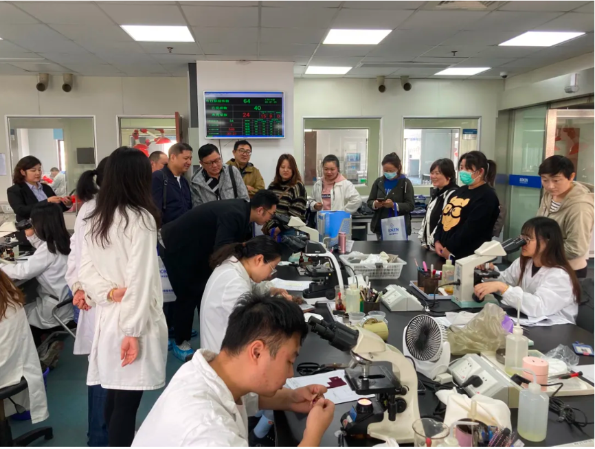 繊維の鑑別や、染色堅牢度の判定などを體験して頂きました。機能性試験においては、試験従事者が実際に試験機を操作し試験方法手順をご紹介いたしました。