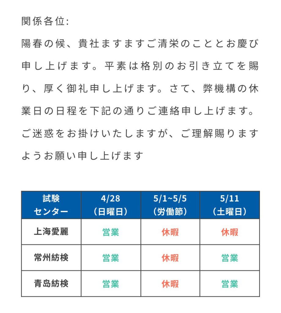 平素は格別のお引き立てを賜り、厚く御禮申し上げます。さて、弊機構の休業日の日程を下記の通りご連絡申し上げます。ご迷惑をお掛けいたしますが、ご理解賜りますようお願い申し上げます。