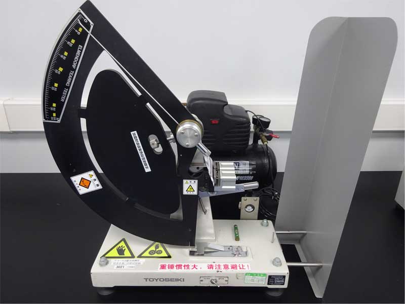 撕破強(qiáng)度試驗(yàn)中有從A法到E法的試驗(yàn)方法,常用的方法D法(沖擊擺錘法)試驗(yàn)片為經(jīng)、緯各取63mm×100mm試驗(yàn)片5枚,設(shè)置在擺錘型的試驗(yàn)機(jī)上,在兩個夾鉗中央切一個20mm的切口,測定撕破剩余43mm的力值。