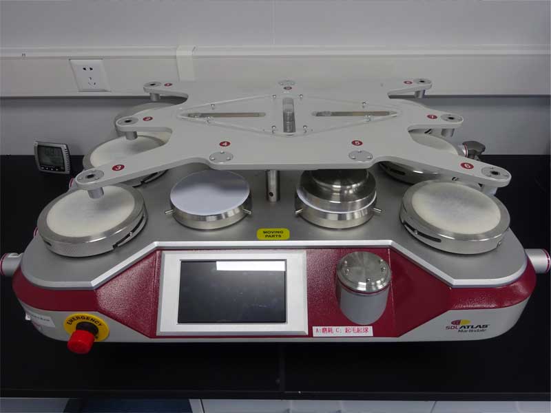 馬丁代爾法(E法):取直徑38±3mm的試樣4枚。將試樣夾具安裝在耐磨儀上,并施加規(guī)定壓重。 當(dāng)摩擦到有兩根以上紗線斷裂、試樣上有摩擦孔洞時、與JIS L 0804 變褪色用灰卡3級同等程度、試樣發(fā)生顯著外觀變化時停止試驗(yàn),記錄摩擦次數(shù)。