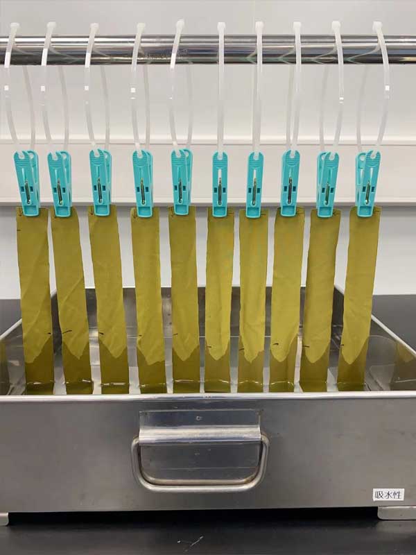 分別取經(jīng)緯向200mm×25mm的試驗(yàn)片,固定上端使試驗(yàn)片垂直,使下端浸入水中。放置10分鐘后,測(cè)量水在試驗(yàn)片內(nèi)上升的高度。