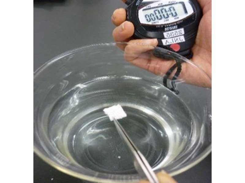 裁取10mm×10mm的試驗(yàn)片,將試驗(yàn)片的測(cè)定面朝下輕放于水中,同時(shí)用秒表測(cè)量試驗(yàn)片濕潤(rùn)沉降的時(shí)間。