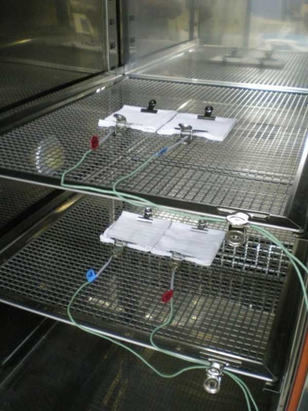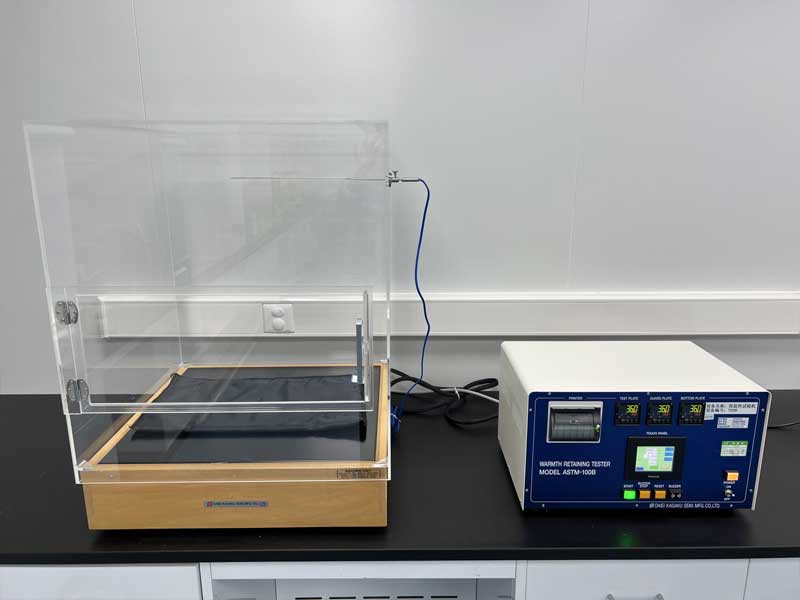 本試驗(yàn)方法參考【紡檢規(guī)格A035】。將20cm×20cm的試驗(yàn)片折成4折,在內(nèi)部安裝熱電偶溫度傳感器,在恒溫恒濕機(jī)中20℃、40%RH的環(huán)境下放置2小時(shí)后,變化為20℃、90%RH的環(huán)境,每分鐘測(cè)量溫度變化至15分鐘。同時(shí)測(cè)量加工品和未加工品,比較上升溫度。